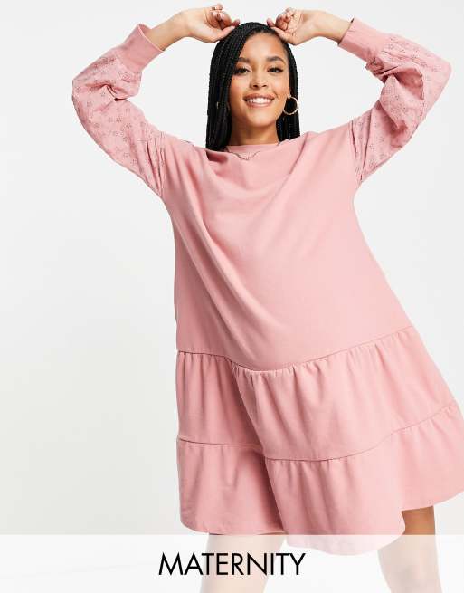 Violet Romance Umstandsmode – Gestuftes Sweatshirt-Kleid mit Ärmeln mit Lochstickerei in Rosa