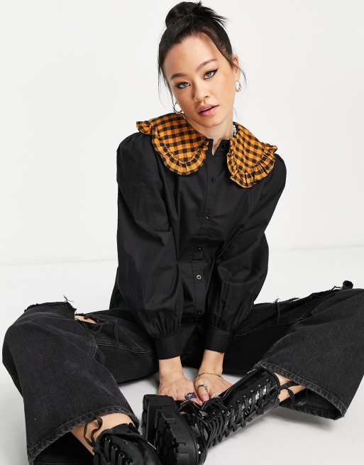 Violet Romance – Baumwollbluse in Schwarz mit kariertem Rüschenkragen
