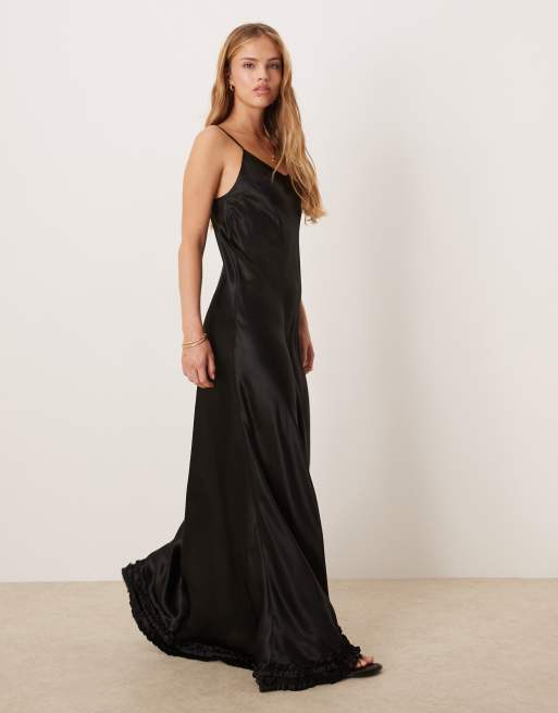 VRG GRL – Alber – Satin-Maxikleid in Schwarz mit Rüschensaum