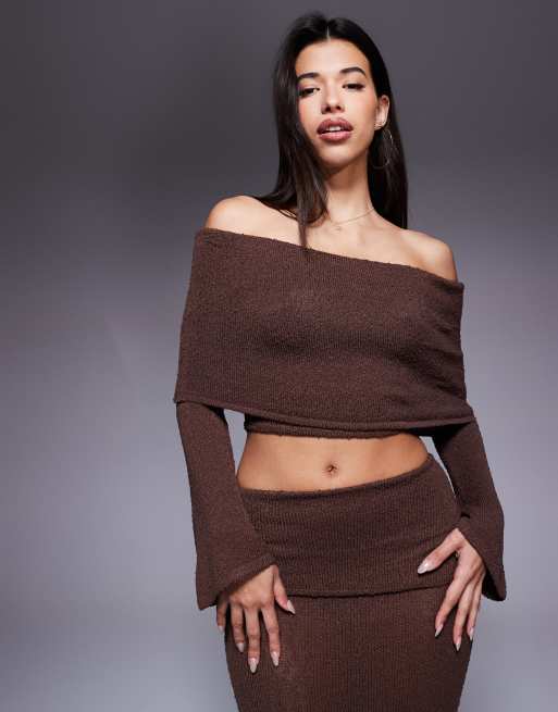 Wander Doll – Yasmin – Bardot-Oberteil aus Bouclé-Strick in dunklem Schokobraun mit breitem Umschlag und ausgestellten Ärmeln, Kombiteil