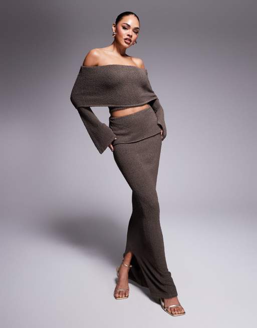 Wanderdoll – Yasmin – Set aus Bouclé-Strick in Schokobraun bestehend aus Oberteil mit breit umgeschlagenen Ausschnitt und Maxirock