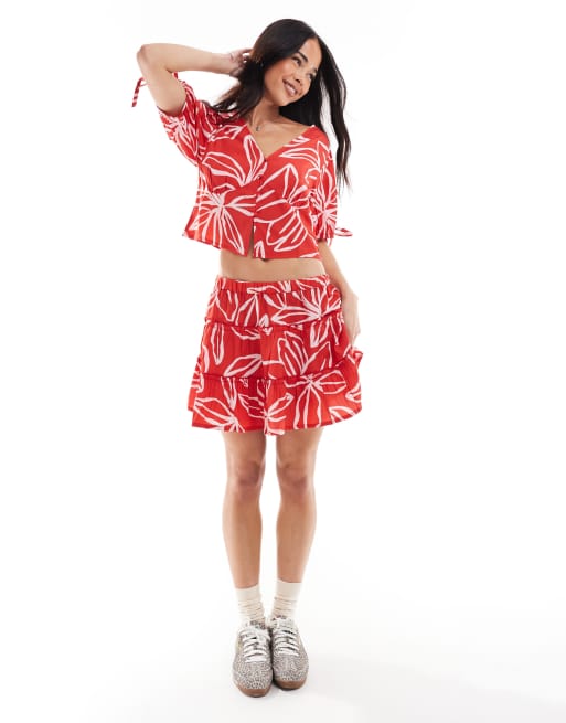 Wednesday's Girl – Cropped Bluse in Rot mit plakativem Blütenmuster, Kombiteil