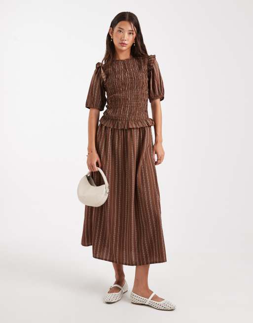 Wednesday's Girl – Gesmoktes Midaxi-Kleid in gestreiftem Braun mit Puffärmeln