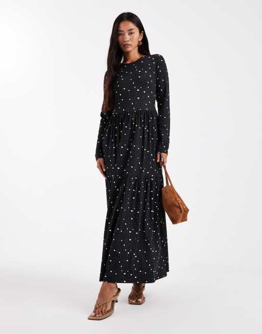 Wednesday's Girl – Langärmliges Midaxikleid in Marineblau mit verwischtem Punktemuster