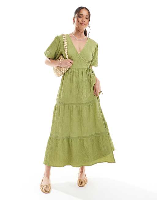 Wednesday's Girl – Strukturiertes Midikleid in Khaki mit Wickeldesign und Puffärmeln