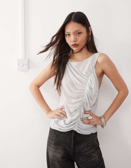 Weekday – Ärmellose Chiffon-Bluse in Hellgrau mit asymmetrisch geraffter Vorderseite