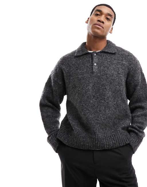 Weekday – Bobby – Locker geschnittener Wollmix-Strickpullover in Dunkelgrau mit Polokragen