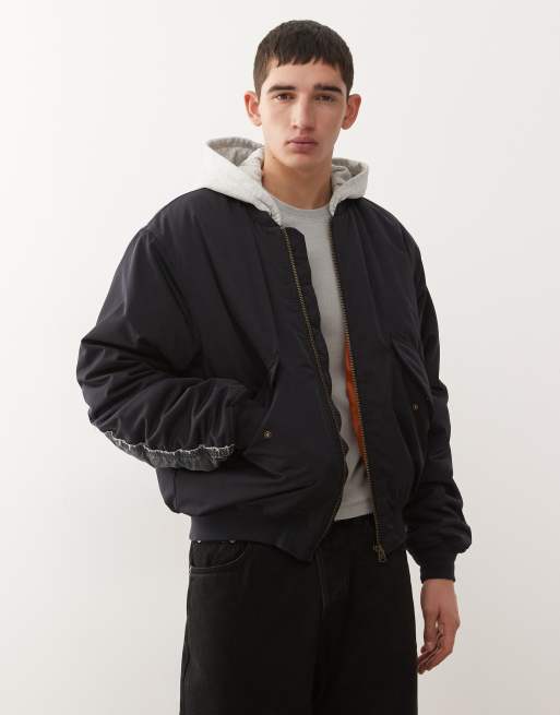 Weekday – Bomberjacke in dunklem Marineblau mit Jersey-Kapuze und kontrastierenden Ärmeln mit Military-Muster