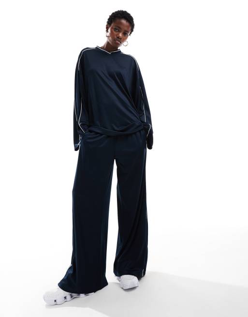 Weekday – Glänzende Jersey-Jogginghose in Blau mit Oversize-Schnitt und weißen Zierstreifen, Kombiteil