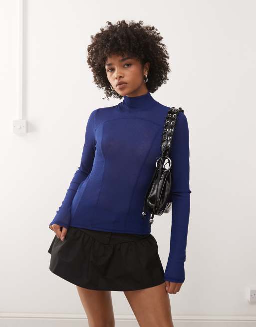Weekday – Hochgeschlossenes, langärmliges Netzstoff-Oberteil in leuchtendem Blau