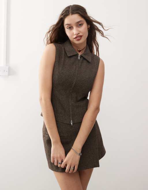 Weekday – Karin – Westen-Top in Braun mit Fischgrätmuster und durchgehendem Reißverschluss, Kombiteil