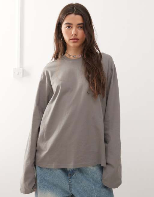 Weekday – Kastiges, langärmliges Oversize-T-Shirt in Dunkelgrau
