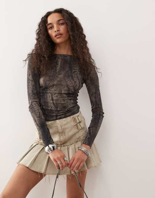 Weekday – Langärmliges, gemustertes Oberteil in Dunkelgrau mit U-Boot-Ausschnitt und Knitterstruktur