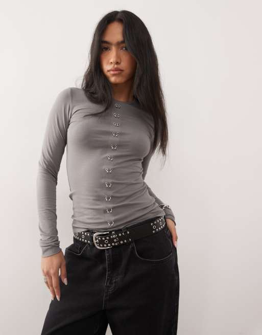 Weekday – Langärmliges Oberteil in Grau mit Piercing-Detail
