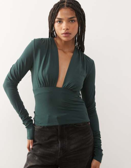 Weekday – Langärmliges, tief ausgeschnittenes Neckholder-Oberteil in Petrolgrün, exklusiv bei ASOS