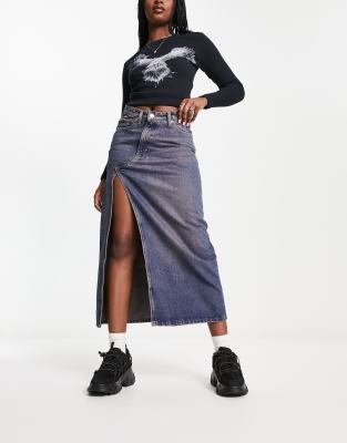 Weekday – Side – Midi-Jeansrock in verwaschenem Blau