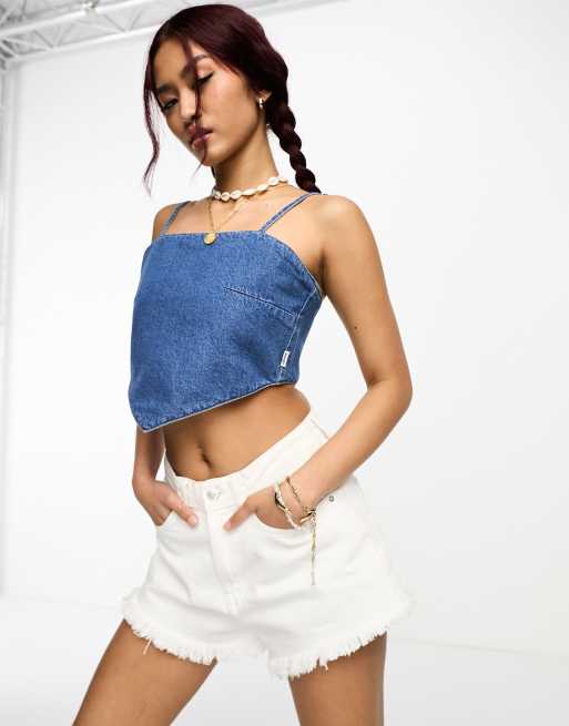 Wrangler – Kurzes Jeans-Oberteil in Blau mit Vorderseite im Bandana-Design
