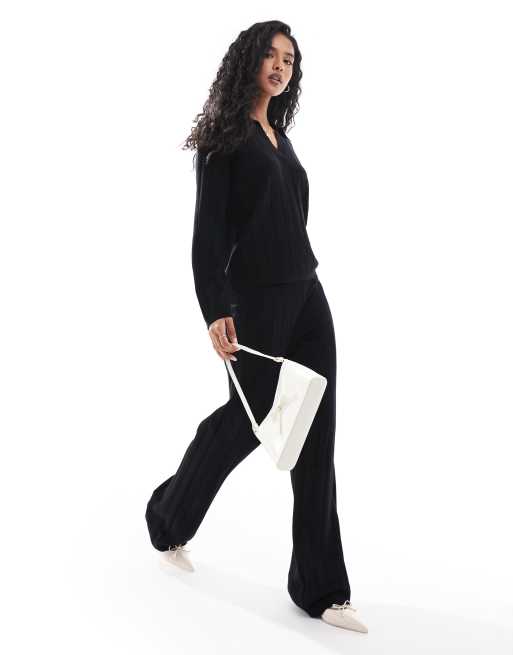 Y.A.S – Gestricktes Set in Schwarz mit breiter Rippenstruktur aus Pullover mit offenem Polokragen und Hose