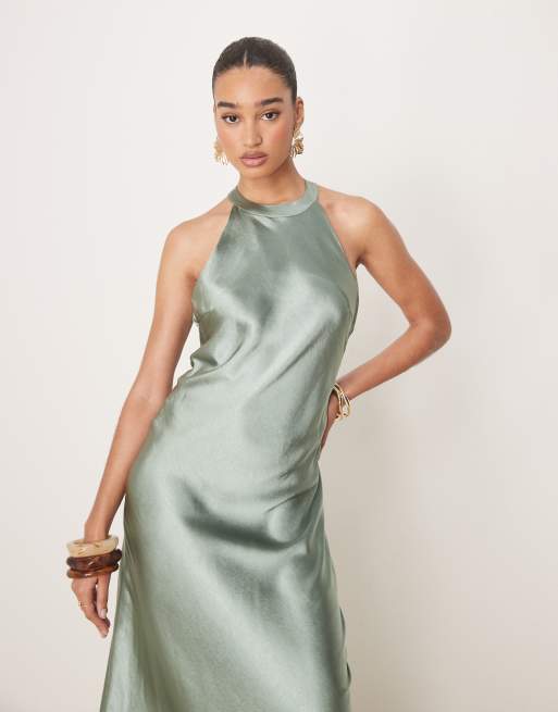 YAS – Hochgeschlossenes Maxikleid aus Satin in Sanftgrün