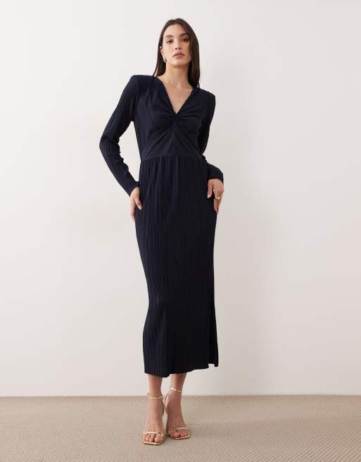 YAS – Langärmliges Plissee-Maxikleid in Marineblau mit verdrehter Vorderseite