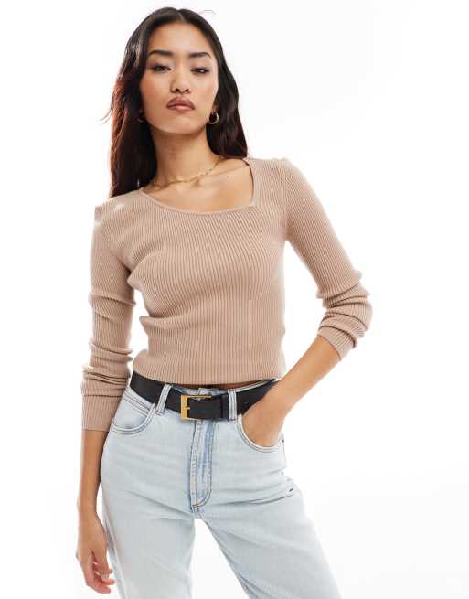 YAS – Langärmliges Strickoberteil in Beige mit asymmetrischem Ausschnitt