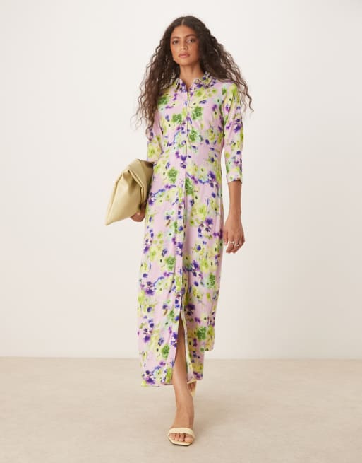 YAS – Maxi-Hemdblusenkleid in blassem Flieder mit übergroßem Blumenmuster