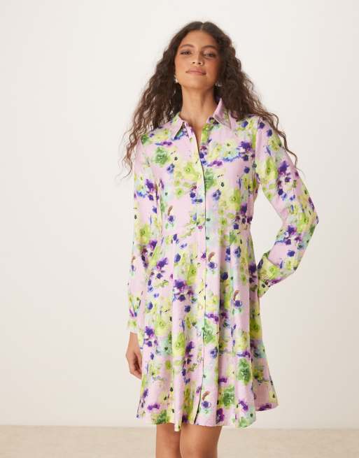 YAS – Mini-Hemdblusenkleid in blassem Flieder mit schwingendem Saum mit Blumenmuster