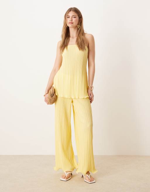 YAS – Plissee-Set in Vanillegelb mit auffälligem Saum, aus trägerlosem Oberteil und weit geschnittener Hose