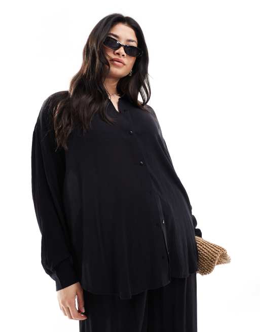 Yours – Oversize-Hemdbluse in Schwarz mit Knitterstruktur, Kombiteil