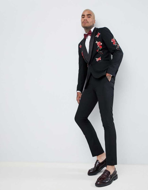 Devils Advocate Skinny Floral Embroidered Tuxedo Suit Jacket