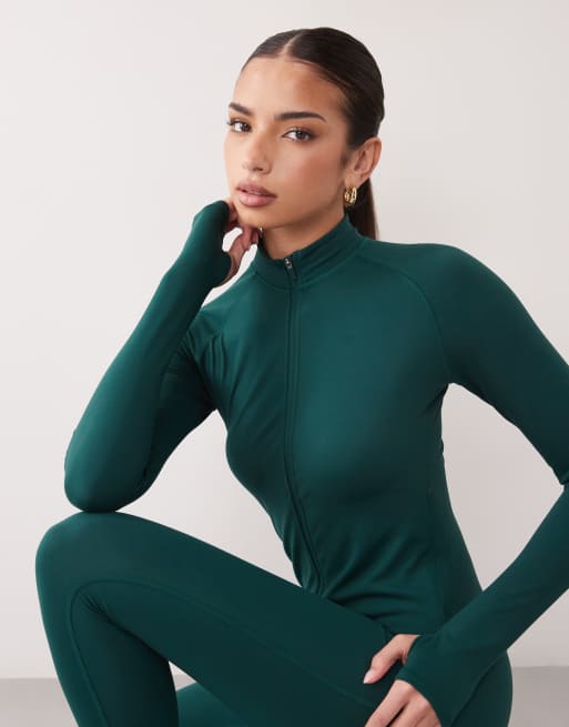 4505 - Icon - Mørkegrøn blød top med lynlås og lange ærmer
