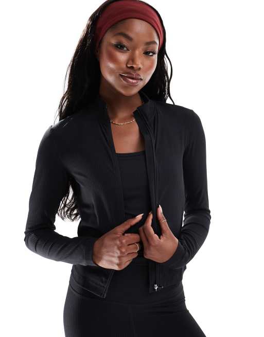 4505 - Sort ribstrikket træningstop med lynlås i performance-materiale