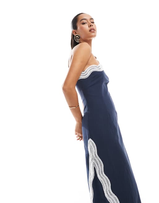 4th & Reckless - Blå bandeau-maxikjole med kontrasterende bølgekanter i hørlook
