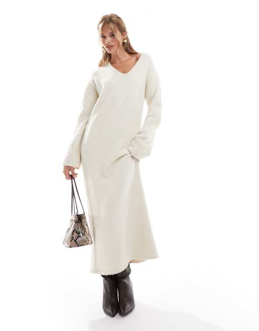 4th & Reckless - Cremehvid maxi-sweaterkjole med V-hals i vamset strikket uldblanding