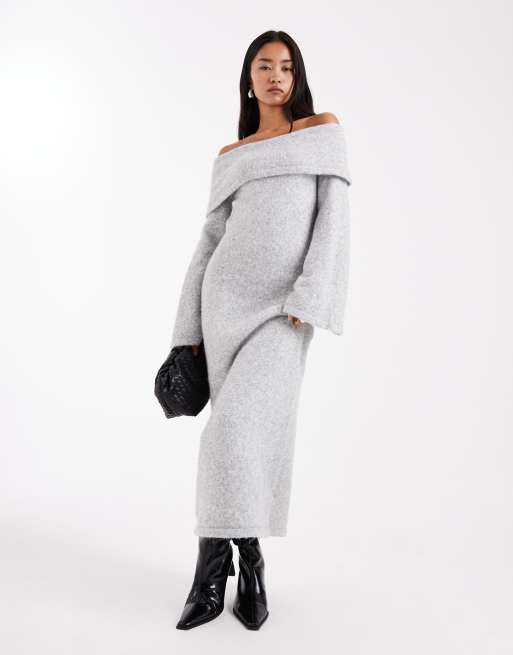 4th & Reckless - Grå sweater-maxikjole med bardot-fold og klokkeformede ærmer i uldagtig strik