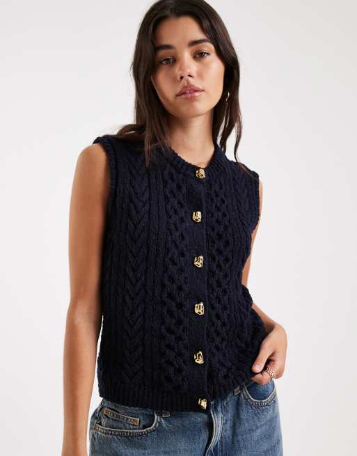 4th & Reckless - Marineblå ærmeløs vest i chunky kabelstrik med guldfarvede knapper