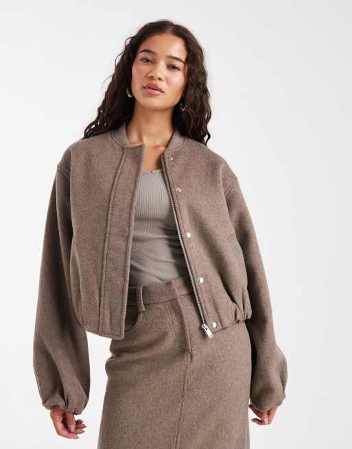 4th & Reckless - Mokkabrun og skræddersyet bomber-jakke uden krave med ballonærmer i blød uldblanding - Del af sæt