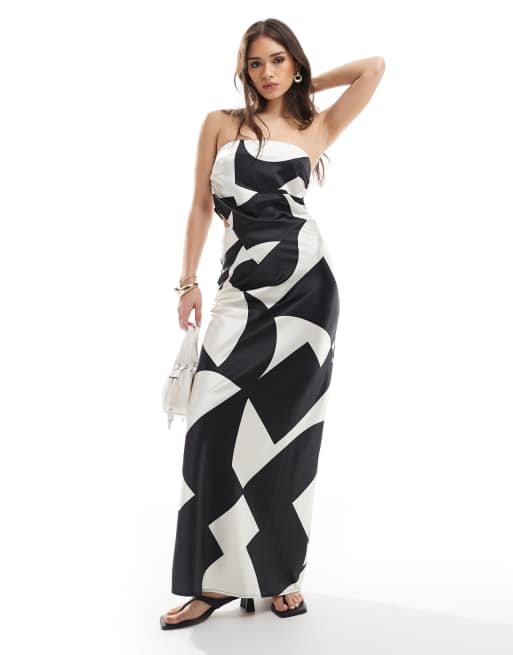 4th & Reckless - Monokromt sæt med bandeau-top med tørklædekant og maxinederdel med print i satin