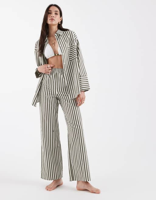 4th & Reckless - Olivengrønt og hvidt sæt med oversized strandskjorte med lomme foran og strandbukser med vide ben og striber