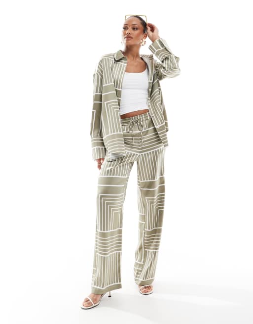 4th & Reckless - Salviegrønt satinsæt med bukser med brede ben og skjorte med brede ærmekanter og knapper fortil i teglprint