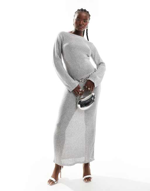 4th & Reckless - Sølvfarvet strikket langærmet maxikjole med pailletter