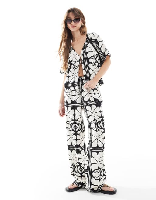 4th & Reckless - Sort og hvidt strandsæt med skjorte med bindefront og V-hals og bukser med blomstermønster