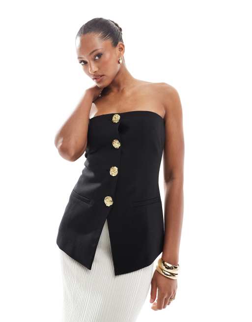 4th & Reckless - Sort skræddersyet bandeau-top med slids foran og guldfarvede knapper
