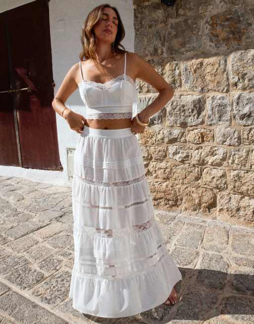 4th & Reckless x Luana Barron - Hvid lagdelt strand-maxinederdel med blondeindsats i hørrigt stof - Del af sæt