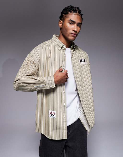 Aape By A Bathing Ape - Beige oversized og langærmet skjorte med striber og broderi på ryggen