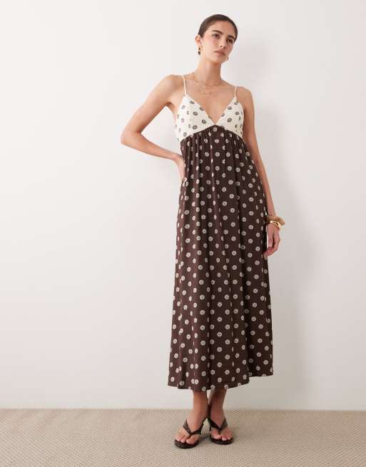Abercrombie & Fitch - Brun flagrende maxikjole med V-hals og indbygget BH samt blomstermønster