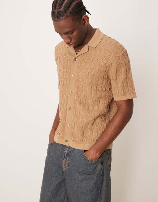 Abercrombie & Fitch - Brun strikket resort-polo med korte ærmer og gennemgående knapper