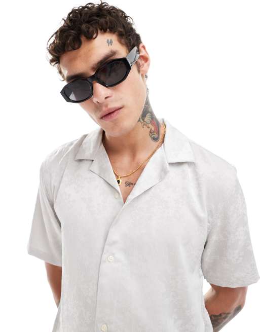 Abercrombie & Fitch - Cropped skjorte med korte ærmer i gråt, silkelignende jacquard i afslappet pasform