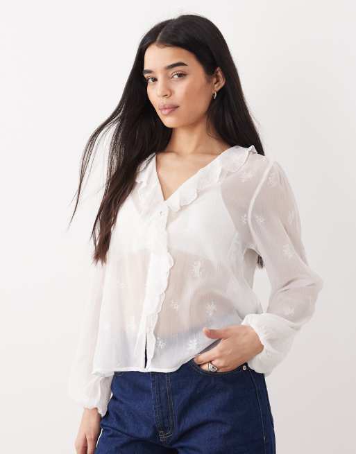 Abercrombie & Fitch - Flagrende hvid bluse med lange ærmer og flæser foran