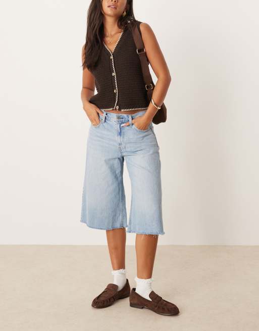 Abercrombie & Fitch - Lyseblå og forvaskede samt lange jeansshorts med mellemhøj talje